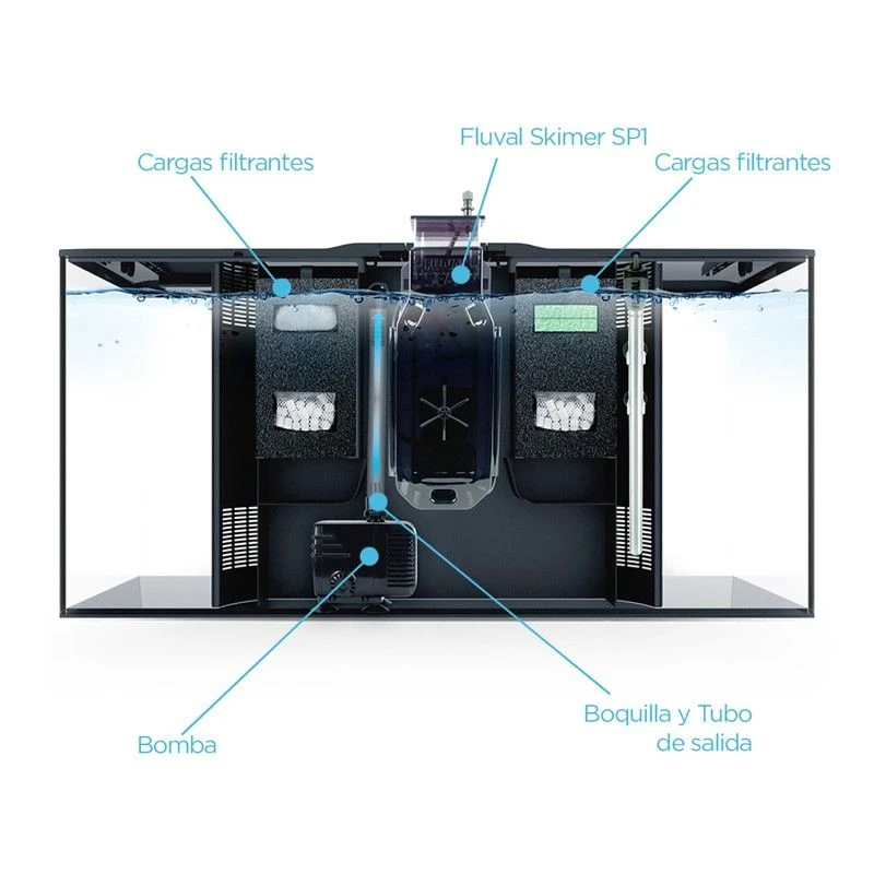 Además, este modelo de Flex Marino contiene un panel especialmente diseñado para el Fluval Skimer PS1, un sistema de recogida de espuma, (se vende por separado) facil de ajustar e instalar, una turbina de 24 aspas cuya función es la inyección de aire para producir burbujas y recolectar proteínas. De esta forma, el acuario tendrá las condiciones similares a las del agua de un arrecife natural.