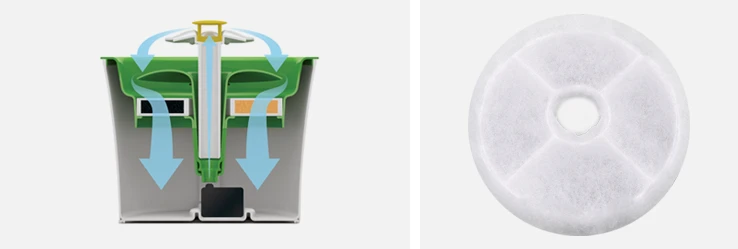 - Un filtro de ablandamiento de agua de doble acción (recambios disponibles por separado). El filtro purifica y suaviza el agua dura del grifo continuamente, mientras que retiene los pelos caídos, sedimentos y residuos.
