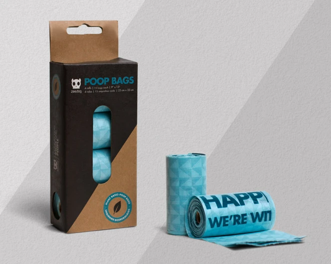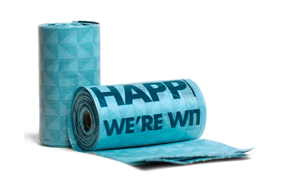 - Cada bolsa en color azul trae una impresión en inglés: «Poop happens, we’re with you».