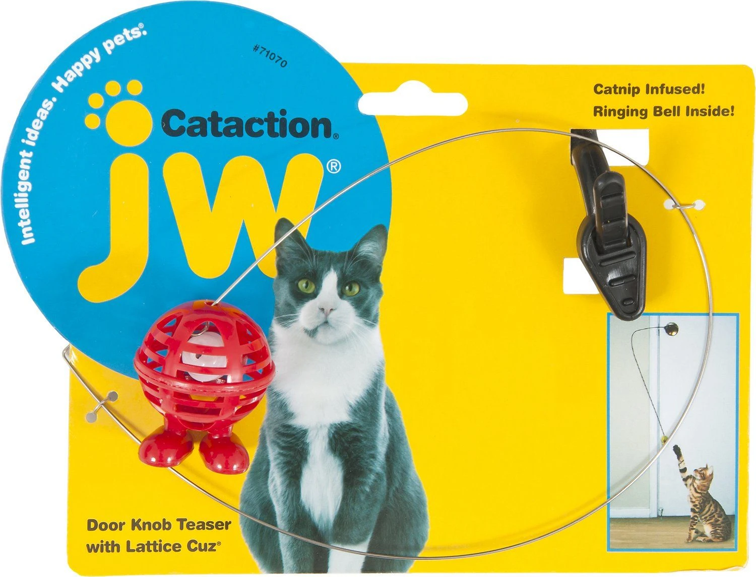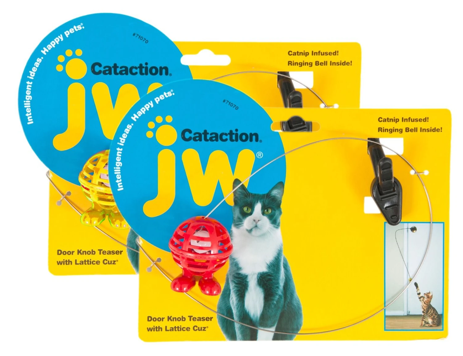 El juguete Caña de pescar con el juguete «Cuz» como señuelo es especial para colgar en la manilla de la puerta de tu casa. Este juguete proporciona un movimiento rápido para poner a prueba la agilidad de tu gato y activa sus instintos naturales de saltar y jugar. Tu gato simplemente amará perseguir y atrapar el juguete «Cuz» en el aire.