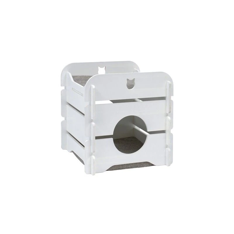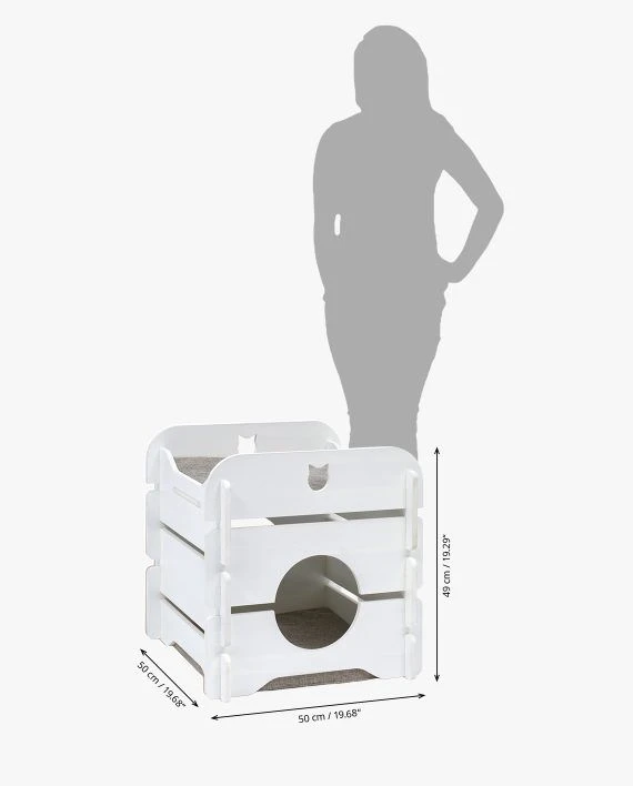 El Cottage Catit Vesper es una pieza cúbica de muebles de gato con estilo de casa romántica. Se trata de un escondite de 2 niveles con un mirador. En la parte inferior tiene lo que llamamos «escondite» y en la parte superior hay un mirador. Ambos están equipados con cojines suaves y acolchados. Además, el escondite tiene dos entradas para que tu gato nunca se sienta acorralado.