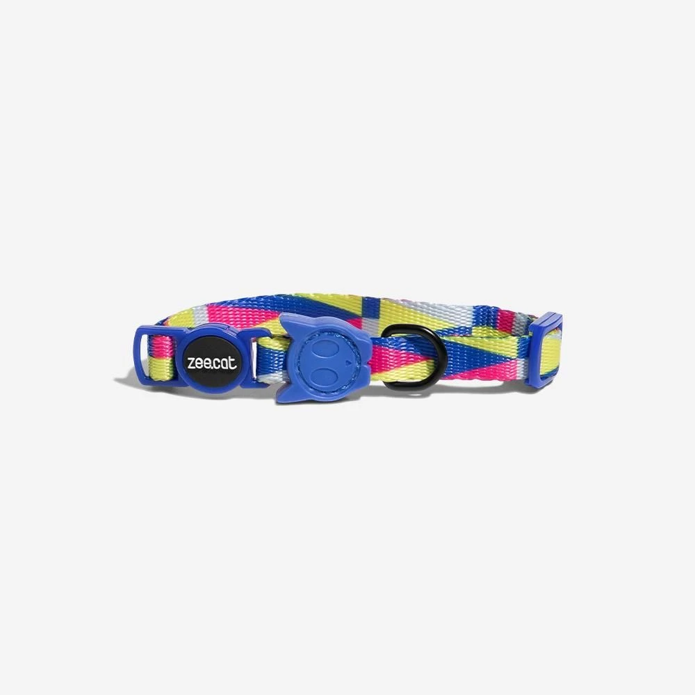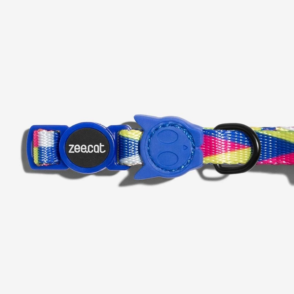 Brillante y colorido collar Zee.Cat de un sólo tamaño para todos los gatos. Su diseño urbano VOLT. Hecho de poliéster de gran calidad y ultra suave para su pelaje. Con la última tecnología en correas que lo hace resistente al clima. Totalmente cómodo, ajustable y para mayor seguridad viene con una hebilla de apertura automática si es que tu gato se atasca y evitar posibles ahogos. Fácil de poner o quitar. Con argolla en forma de «D» de aleación de zinc para fijar a su correa.