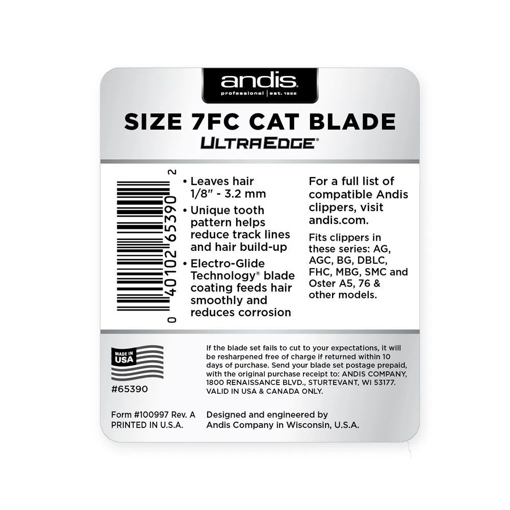 Cuchilla Desmontable Andis UltraEdge «Cat Blade» Tamaño 7FC está diseñada para cortar especialmente el pelaje de los gatos gracias a su patrón especial de dientes y Electro-Glide Technology. Se adapta a las máquinas de corte con hojas desmontables como los modelos Andis: AG, AGC, BG, DBLG, FHC, MBC, SMC. Además se adapta a los modelos Oster 76, A-5 y otros modelos. Puedes revisar el listado completo en andis.com.