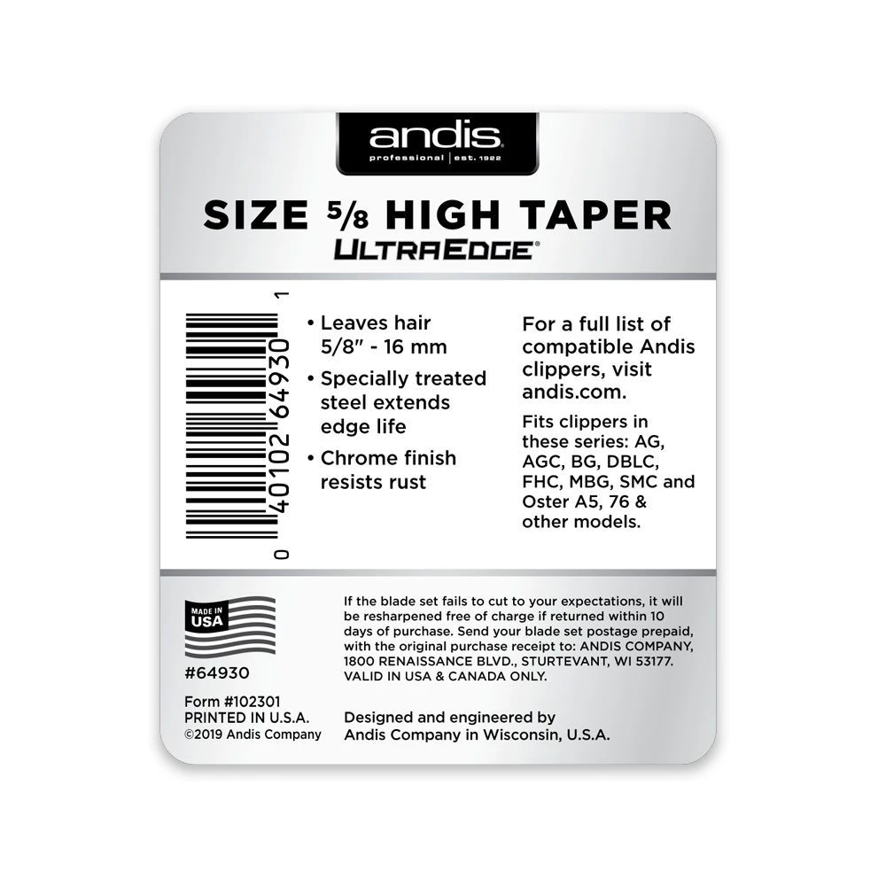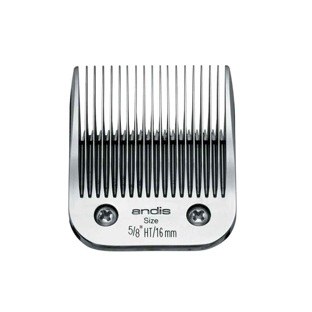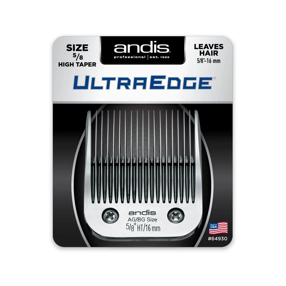 La Cuchilla u hoja desmontable Andis UltraEdge Tamaño 5/8 HT está fabricada de acero carbonizado para una vida útil más prolongada. Su acabado cromado resiste el óxido y se adapta a las máquinas de corte con hojas desmontables como los modelos Andis: AG, AG2, AGC, AGP, AGC2, AGR, AGR, AGR+, AGRC, AGRV, AGCL, BG, DBLC, MBG, MBG2, SMC. Además se adapta a los modelos Oster 76, 111 y A-5.