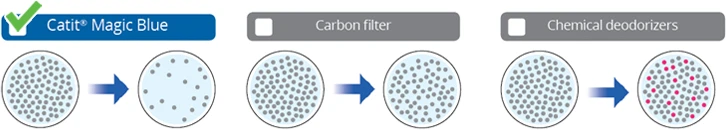 El sentido del olfato de un gato es unas 15 veces más fuerte que el nuestro. Así que cuando los olores irritantes se acumulan en el interior de la caja de arena, ciertamente no estamos haciéndole ningún favor a nuestro gato. Usando el filtro Magic Blue en combinación con una adecuada limpieza de la caja de arena, como usar la pala y limpiar regularmente, resultará rápidamente en una mejor calidad del aire para ti y para tu gato.