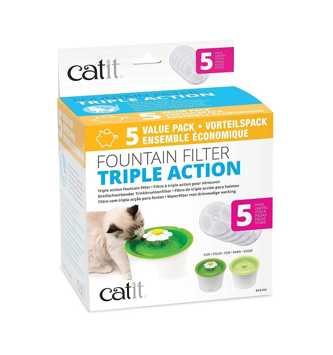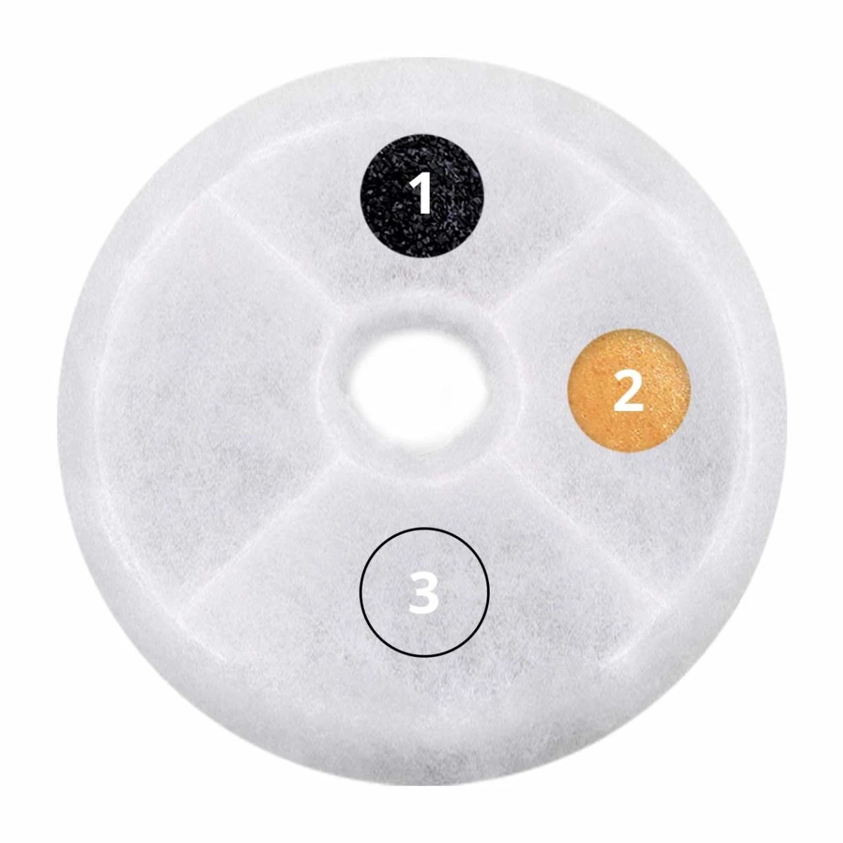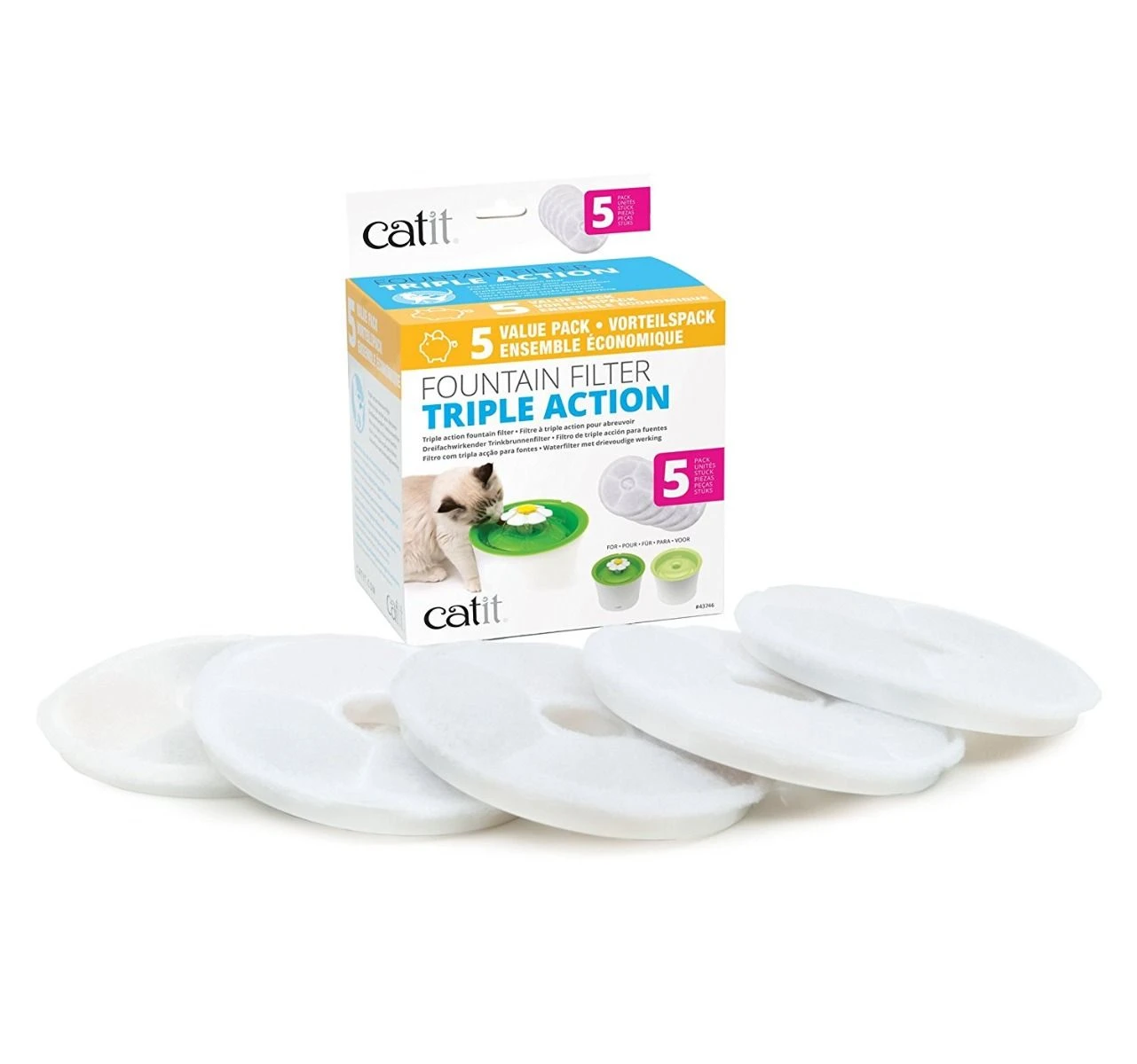Filtros de repuesto de triple acción especial para el «Bebedero Estilo Fuente Floral» de la línea SENSES 2.0. Con resina de intercambio iónico que suaviza el agua eliminando su contenido de magnesio y calcio. Estos pueden acumularse en el tracto urinario inferior y provocar enfermedades del tracto urinario, el cuál es un problema común en gatos. Con carbón activado que elimina bacterias y los olores de cloro para mejorar el sabor del agua y malla que filtra las impurezas del agua tales como residuos, alimento, pelo y sedimentos.