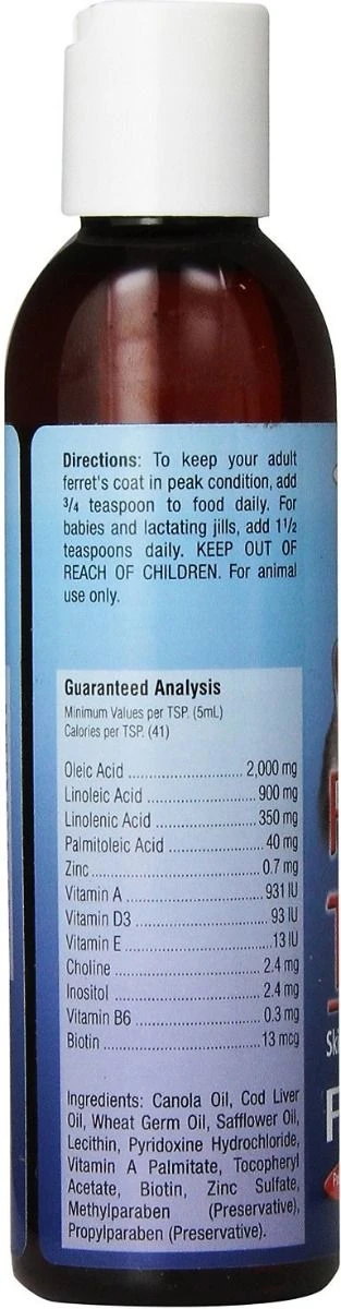 - Para mantener el pelaje de tu hurón de edad adulta (mayor de 9 meses) en óptimas condiciones, añade 3/4 de una cucharadita a la comida diariamente.