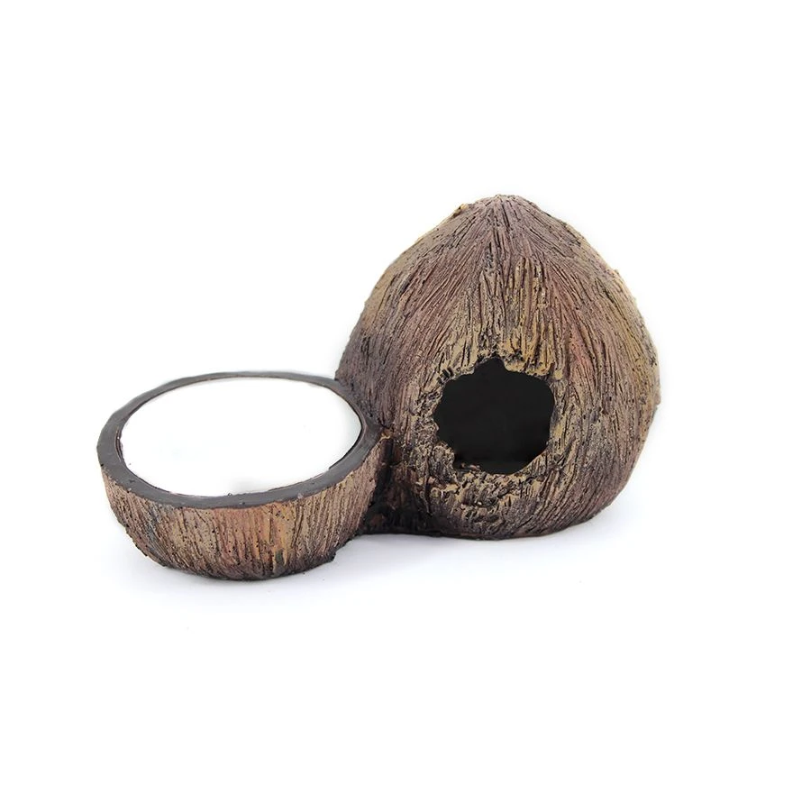 La característica realista de Coconut permite que el escondite con el plato de agua encaje perfectamente en un terrario con temática de Hawaiian Tiki.