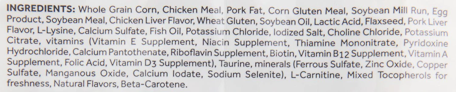Ingredientes: Maíz entero, harina de pollo, grasa de cerdo, harina de gluten de maíz, cascarilla de soya, producto de huevo, harina de soya, saborizante de hígado de pollo, gluten de trigo, aceite de soya, linaza, saborizante de hígado de cerdo, L-lisina, sulfato de calcio, aceite de pescado, cloruro de potasio, sal yoyada, cloruro de colina, citrato de potasio, vitaminas (complemento de vitamina E, complemento de niacina mononitrato de tiamina, clorhidrato de piridoxina, pantotenato de calcio, complemento de riboflavina, biotina, complemento de vitamina B12, complemento de vitamina A, ácido fólico, complemento de vitamina D3), taurina, minerales (sulfato ferroso, óxido de zinc, sulfato de cobre, óxido manganoso, yodato de calcio, selenito de sodio), L-carnitina, tocoferoles mixtos para la frescura, sabores naturales, beta caroteno.