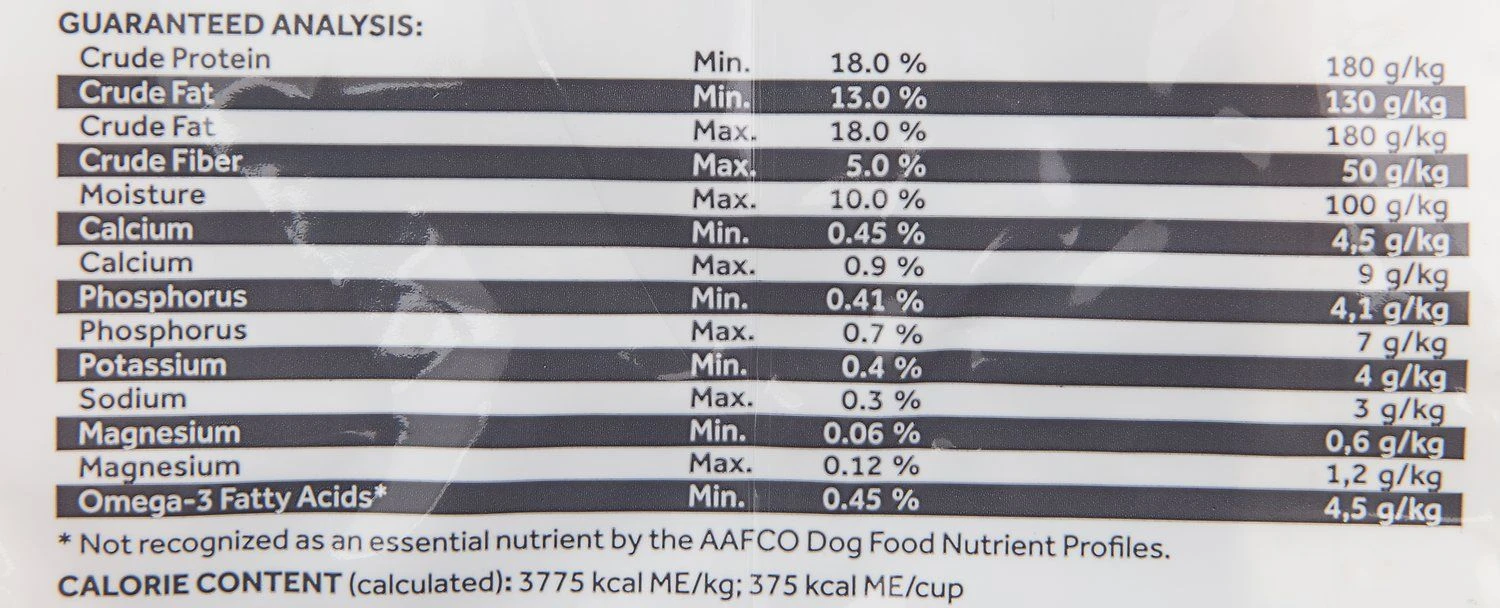 - Contenido calórico: 3775 Kcal EM/kg; 375 kcal EM/lata.