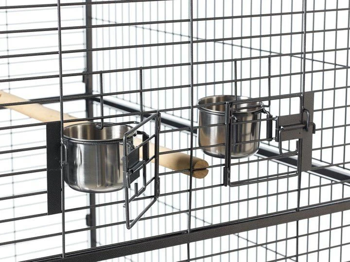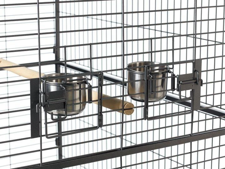 - Los recipientes para comida/agua/golosinas se mantienen en su lugar y los pájaros no pueden volcarlos ni quitarlos.