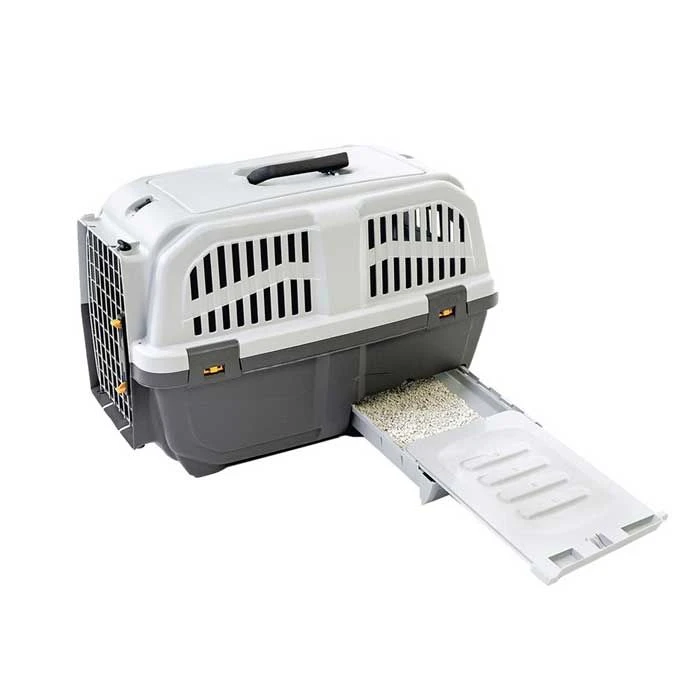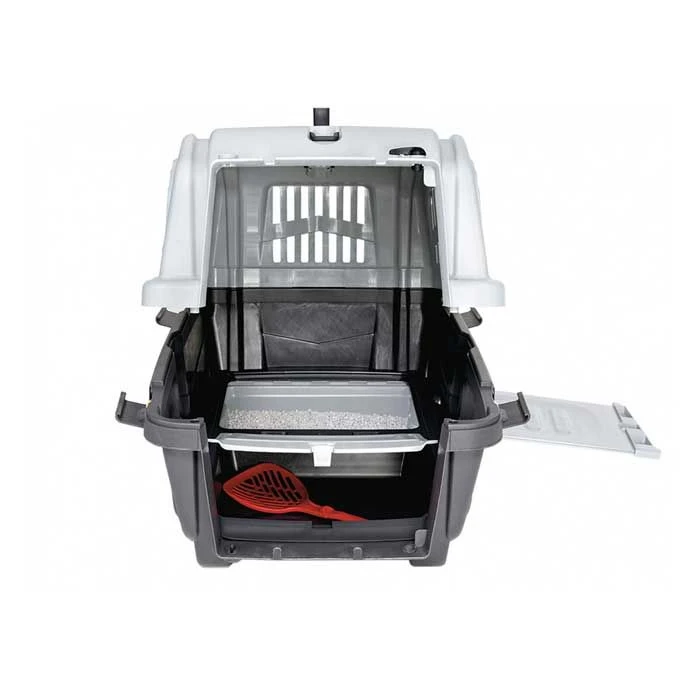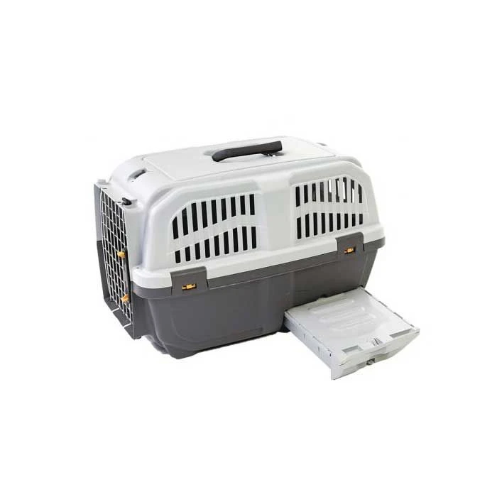 Está fabricado con plástico de gran calidad, no tóxico y de gran resistencia. El transportador se compone de tres elementos, una base de color gris oscuro, una tapa color gris claro con diferentes aberturas para que fluya el aire y dos manillas para tener la comodidad de sostenerlo, además cuenta con una puerta de rejillas que te permite introducir a tu mascota.