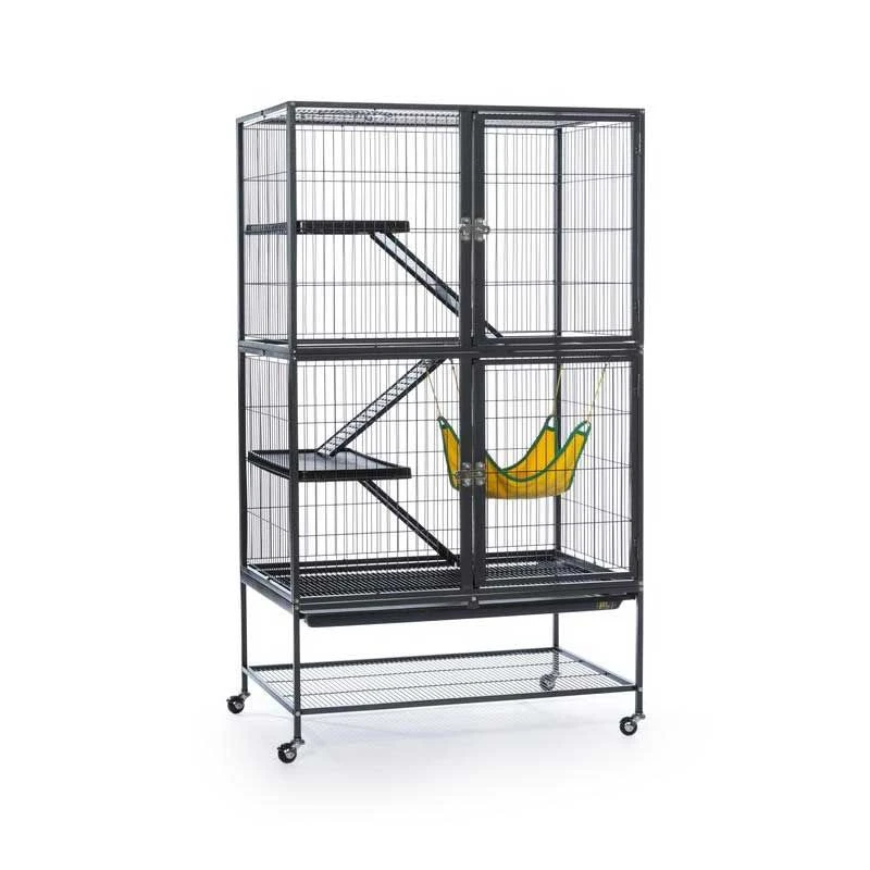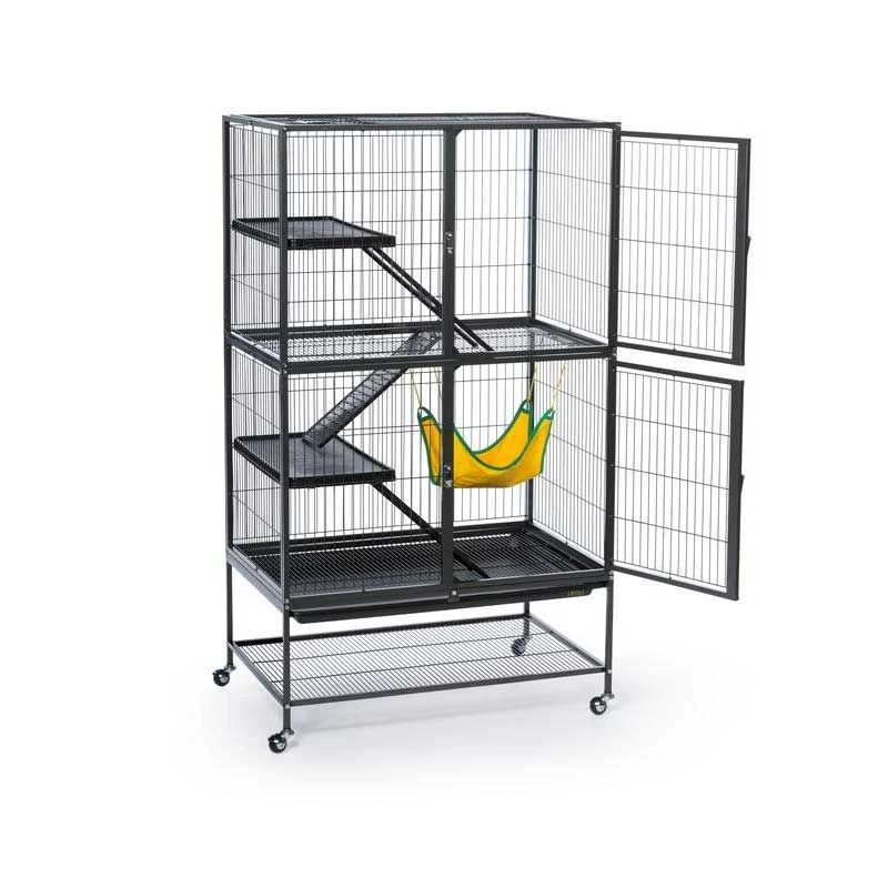 La Jaula y Hábitat Prevue para Hurones complementará cualquier habitación con su acabado negro y mide 78 cm de largo, 50 cm de ancho, 104 cm de alto (137 cm de alto en el soporte) con un espacio entre cables de 2,2 cm.