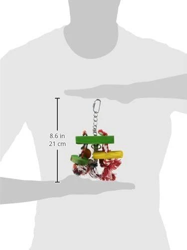 Cada juguete único consiste en una combinación de baratijas interesantes como formas de madera maciza, cuerda resistente, cuentas de plástico, tiras de cuero y campanas. Cada juguete viene con un clip para colgar para una fácil instalación en la jaula.