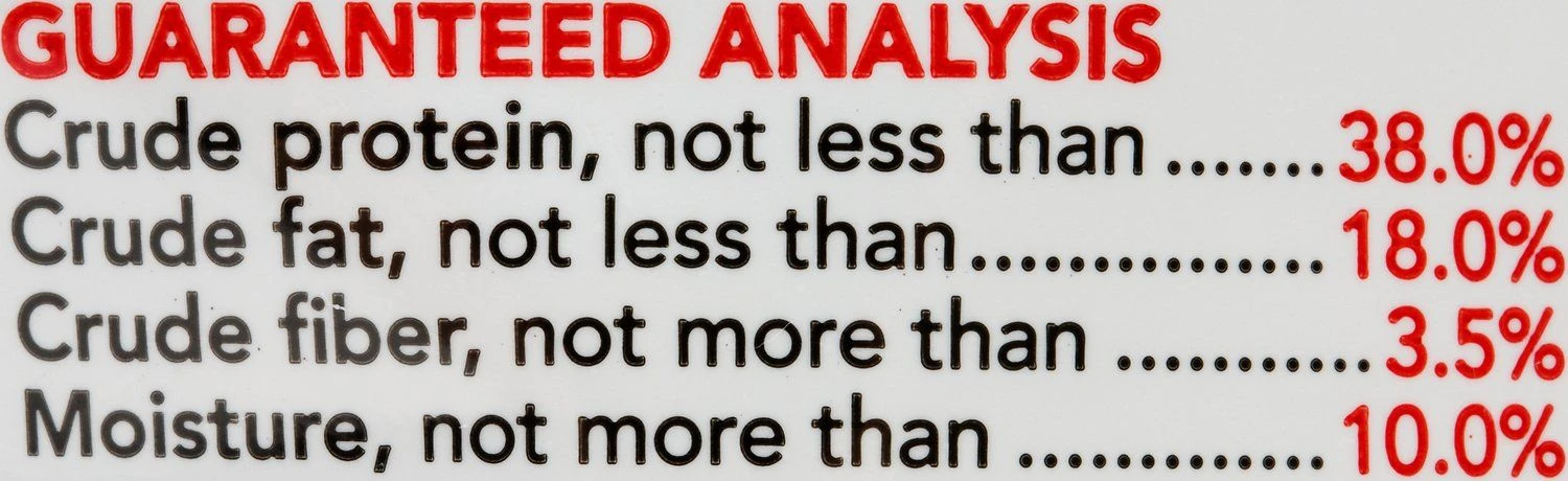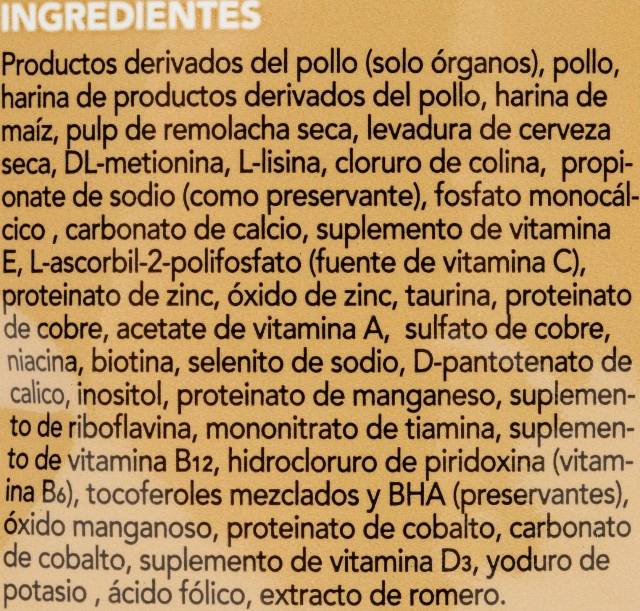 Ingredientes: Productos derivados de pollo (solo órganos), pollo, harina de subproductos de pollo, harina de maíz, pulpa de remolacha deshidratada, levadura de cerveza seca, DL-metionina, L-lisina, cloruro de colina, propionato de sodio (como preservantes), fosfato monocálcico, carbonato de calcio, suplemento de vitamina E, L-ascorbil-2-Polifosfato (fuente de vitamina C), proteinato de zinc, óxido de zinc, taurina, proteinato de cobre, acetato de vitamina A, sulfato de cobre, niacina, biotina, selenito de sodio, D-pantotenato de calico, Inositol, proteinato e manganeso, suplemento de riboflavina, mononitrato de tiamina, suplemento de vitamina B12, hidroclocluro de piridoxina, (vitamina B6), tocoferoles mezclados y BHA (preservante), óxido manganoso, proteinato de cobalto, carbonato de cobalto, Suplemento de vitamina D3, yoduro de potasio, ácido fólico, extracto de romero.