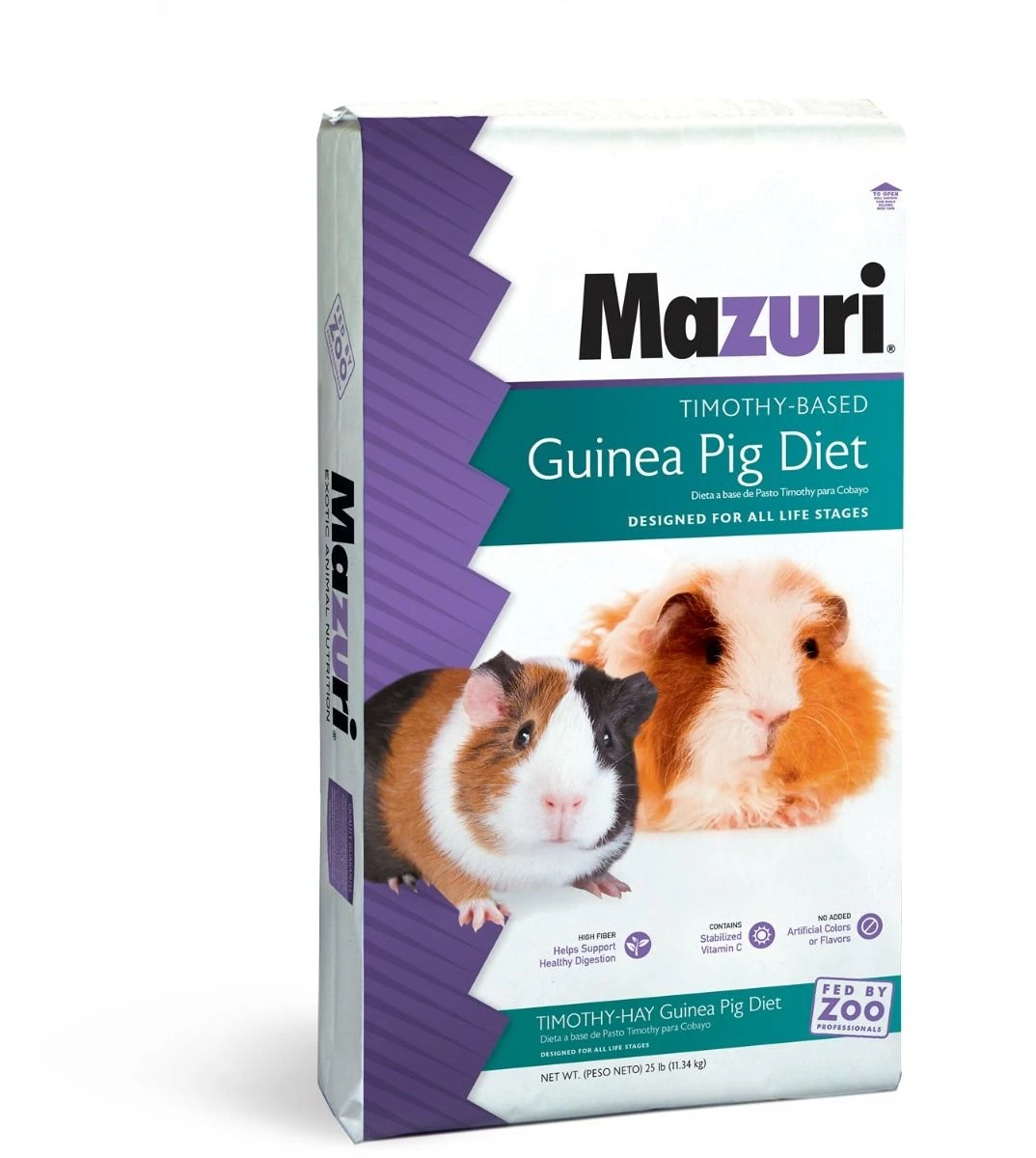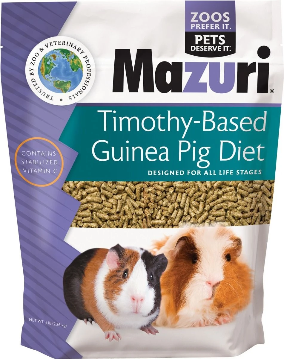 - Alimente sin restricción a sus cuyes con Mazuri «Guinea Pig Diet» con base Timothy junto con suficiente agua fresca.