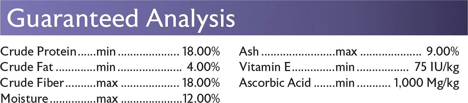 Ingredientes: Heno de pasto Timothy molido, cascaras de soja molida, mollejas de trigo, harina de soja descascarada, avena molida, semilla de lino, melaza de caña, trigo integral, carbonato de calcio, aceite de soja, sal, fosfato dicálcico, suero deshidratado, lascoril-2-polifosfato(vitamina C estabilizada), óxido de magnesio, cloruro de colina, dl-metionina, producto de fermentación de Lactobacillus acidophilus deshidratado, producto de fermentación de Lactobacillus casei deshidratado, producto de la fermentación de Bifidobacterium thermophilum deshidratado, suplemento de la vitamina A, extracto de yucca shidigera, producto de fermentación Enterococcus faecium deshidratado, menadiona sódica complejo de bisulfito (fuente de vitamina K), suplemento de vitamina D3, ácido fólico, clorhidrato de piridoxina, casco de arroz, pantotenato de calcio, acetato de d-alfa tocoferol, riboflavina, aceite vegetal, mononitrato de tiamina, suplemento de vitamina B12, ácido nicotínico, carbonato de cobalto, óxido de manganeso, óxido de zinc, carbonato ferroso, sulfato de cobre, sulfato de zinc, yodato de calcio, selenito de sodio.