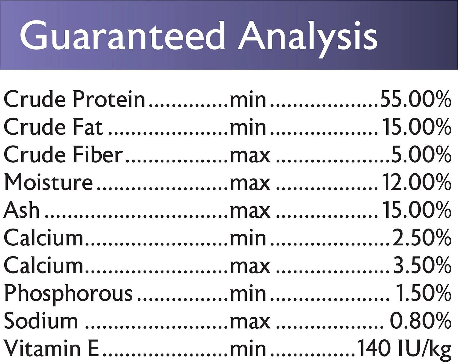 Ingredientes: Harina de pescado menhaden, maíz molido, harina de soja descascarada, harina de subproductos avícolas, harina de gluten de maíz, aceite de pescado menhaden, harina de carne porcina, sal, levadura de cerveza secada, óxido de magnesio, cloruro de colina, acetato de d-alfa-tocoferilo (fuente natural de vitamina E), niacina, l-ascorbil-2, polifosfato (vitamina C estabilizada), óxido de zinc, óxido manganeso, carbonato de calcio, carbonato ferroso, pantotenato de calcio, tocoferoles mixtos (conservante natural), riboflavina, Suplemento de vitamina B12, sulfato de cobre, mononitrato de tiamina, piridoxina clorhidrato, complejo de bisulfito de sodio de menadiona (Vitamina K), dl-metionina, ácido fólico, sulfato de zinc, acetato de vitamina A, yodato de calcio, biotina, carbonato de cobalto, colecalciferol (vitamina D3).