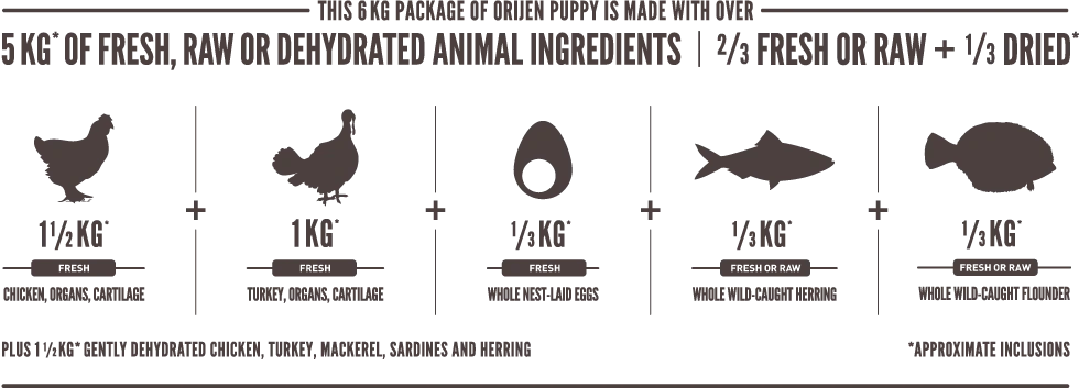 Hecho con un 85% de ingredientes cárnicos de primera calidad, ORIJEN Puppy ofrece un rico, nutritivo y Biológicamente Apropiado nivel de proteína del 38% para semejar, lo mejor posible, la dieta natural de tu cachorro.