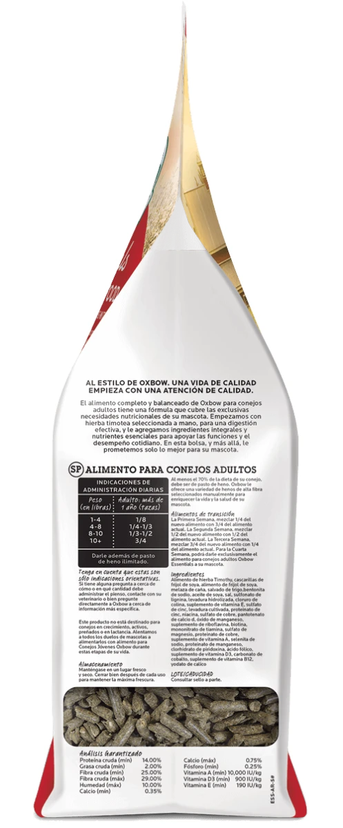 - Alimento no destinado para conejos en crecimiento, activos, preñadas o en lactancia. En estas etapas es mejor alimentarlos con el Alimento Oxbow para Conejo Joven.