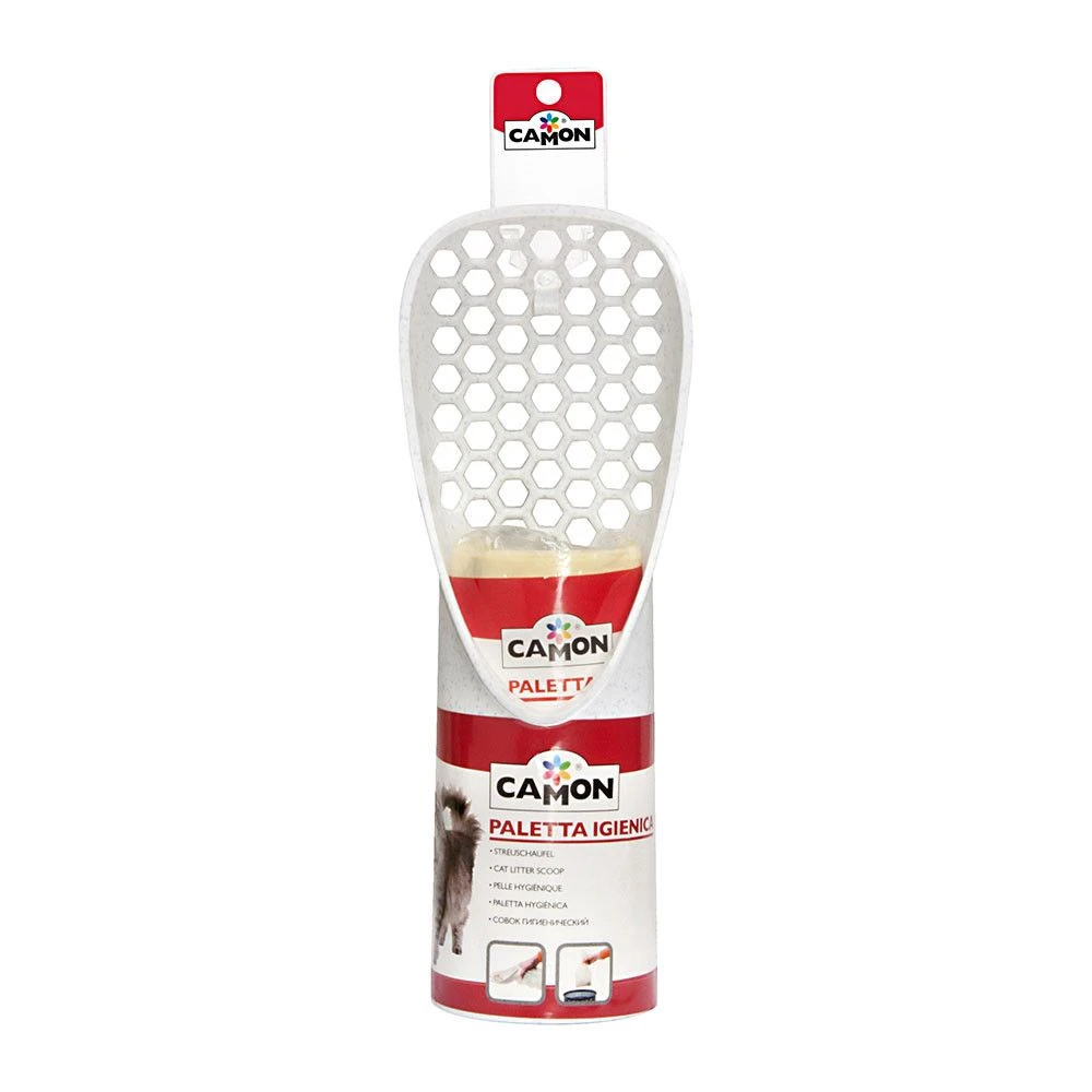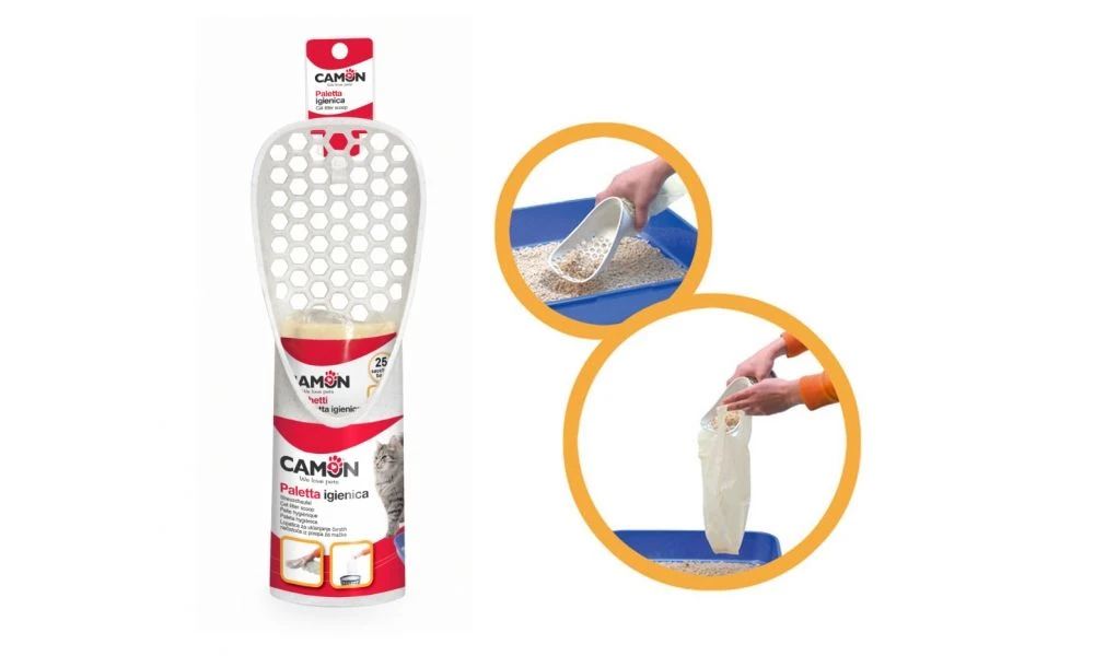 - Pala sanitaria de plástico resistente con un mango hueco que permite que se deslicen las fecas o desechos hacia la bolsa.