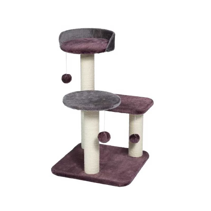 Además de la cama para gatos, dos plataformas adicionales ofrecen oportunidades para saltar y jugar, y suficiente espacio vertical para que varios gatos se acuesten cómodamente. Tres juguetes colgantes y mullidos cuelgan juguetonamente, uno de la cama para gatos y uno de cada plataforma.